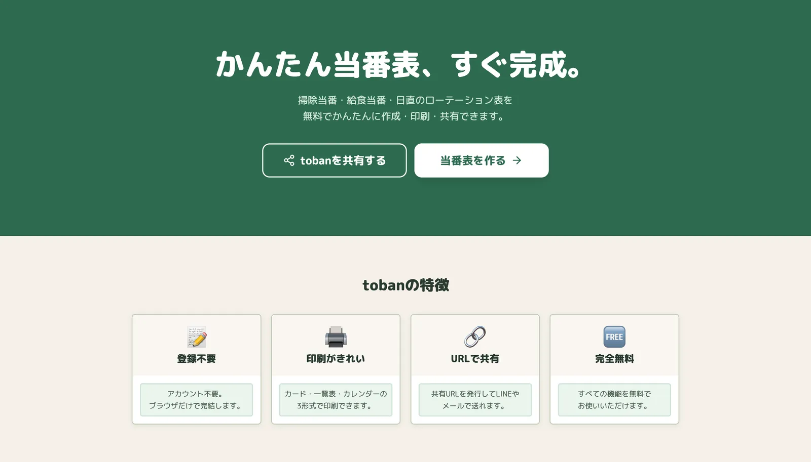 掃除当番・給食当番・日直などのローテーション表を作成・印刷・共有できる無料Webアプリ。幼稚園・保育園・小学校・PTA・介護施設・自治会・飲食店・家庭まで、幅広い現場を想定して開発しました。